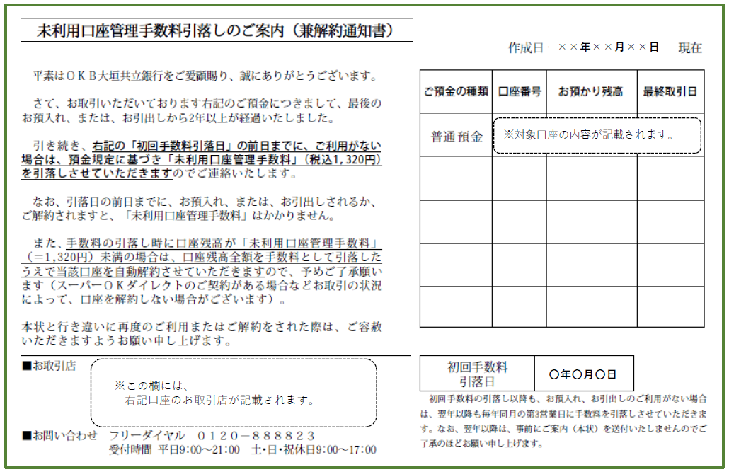 対象口座には、「未利用口座管理手数料引落しのご案内(兼解約通知書)」(以下「ご案内はがき」)が発送されます。