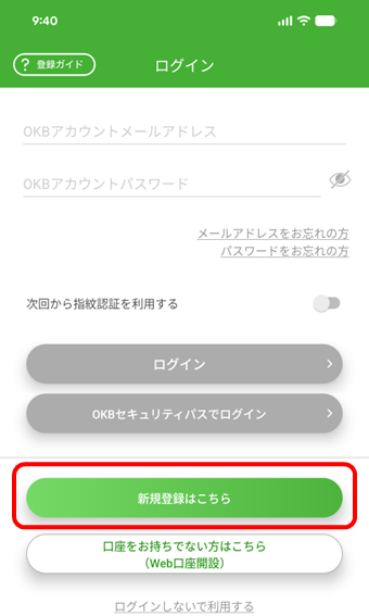 OKBアプリのログイン画面中段の「新規登録はこちら」ボタンから、OKBアカウントの新規登録などOKBアプリの「初期登録」を行うことができます。OKBアカウントの利用口座登録が完了した後、続けて「OKBセキュリティパスを登録する」をタップすると、OKBセキュリティパスの登録を行うことができます。