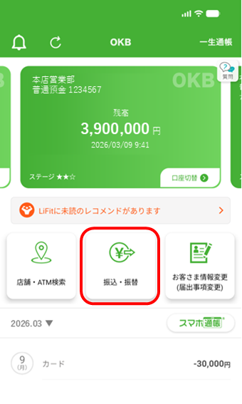 OKBアプリにログインいただき、ホーム画面中段の「振込・振替」ボタンからOKBセキュリティパスの登録を行うことができます。
