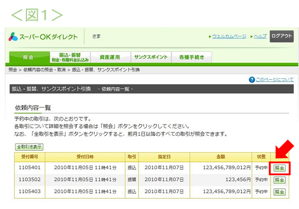 - 「依頼内容一覧」から、取り消したい取引の「照会」ボタンを選択<図1>