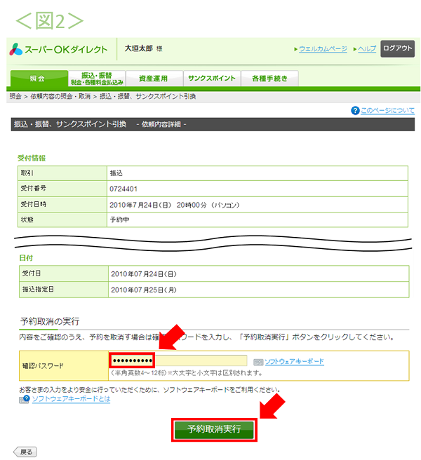 - 「依頼内容詳細」画面で、確認パスワードを入力のうえ、「予約取消実行」ボタンを選択<図2>